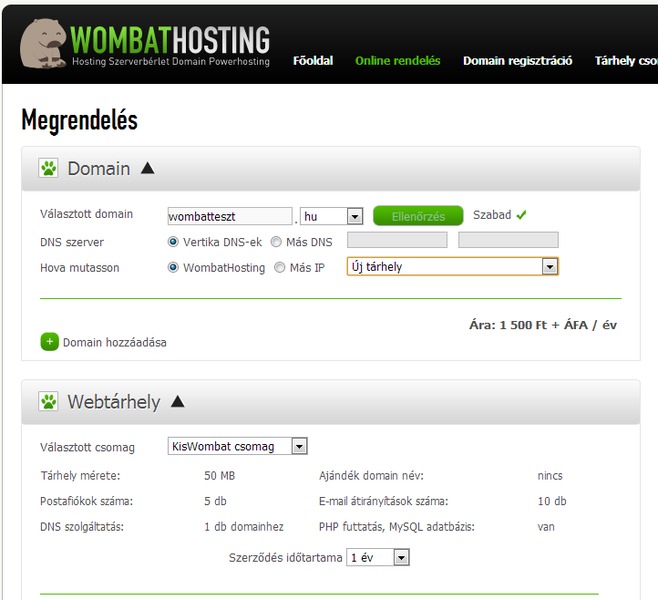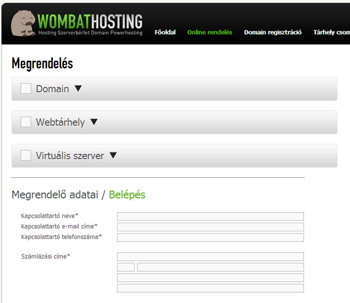 Domain, tárhely csomag, vagy virtuális gép rendelése az "Online rendelés" menüponton keresztül lehetséges. Itt értelemszerűen ki kell tölteni, hogy mire van szükséged, majd meg kell adni az adataidat.