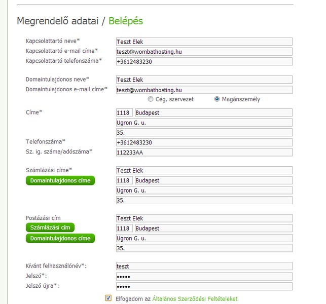 A "Megrendelő adatai" résznél kell megadnod, hogy ki is vagy, milyen címeken vagy elérhető, illetve milyen felhasználónevet szeretnél használni nálunk. (Ezzel a felhasználónévvel fogod tudni kezelni a szolgáltatásokat, amiket rendeltél.) Ha már regisztrált felhasználónk vagy, és be vagy lépve, akkor természetesen nem kell újra megadni mindent, de ha valami hiányzott korábban, akkor azt meg kell adnod.